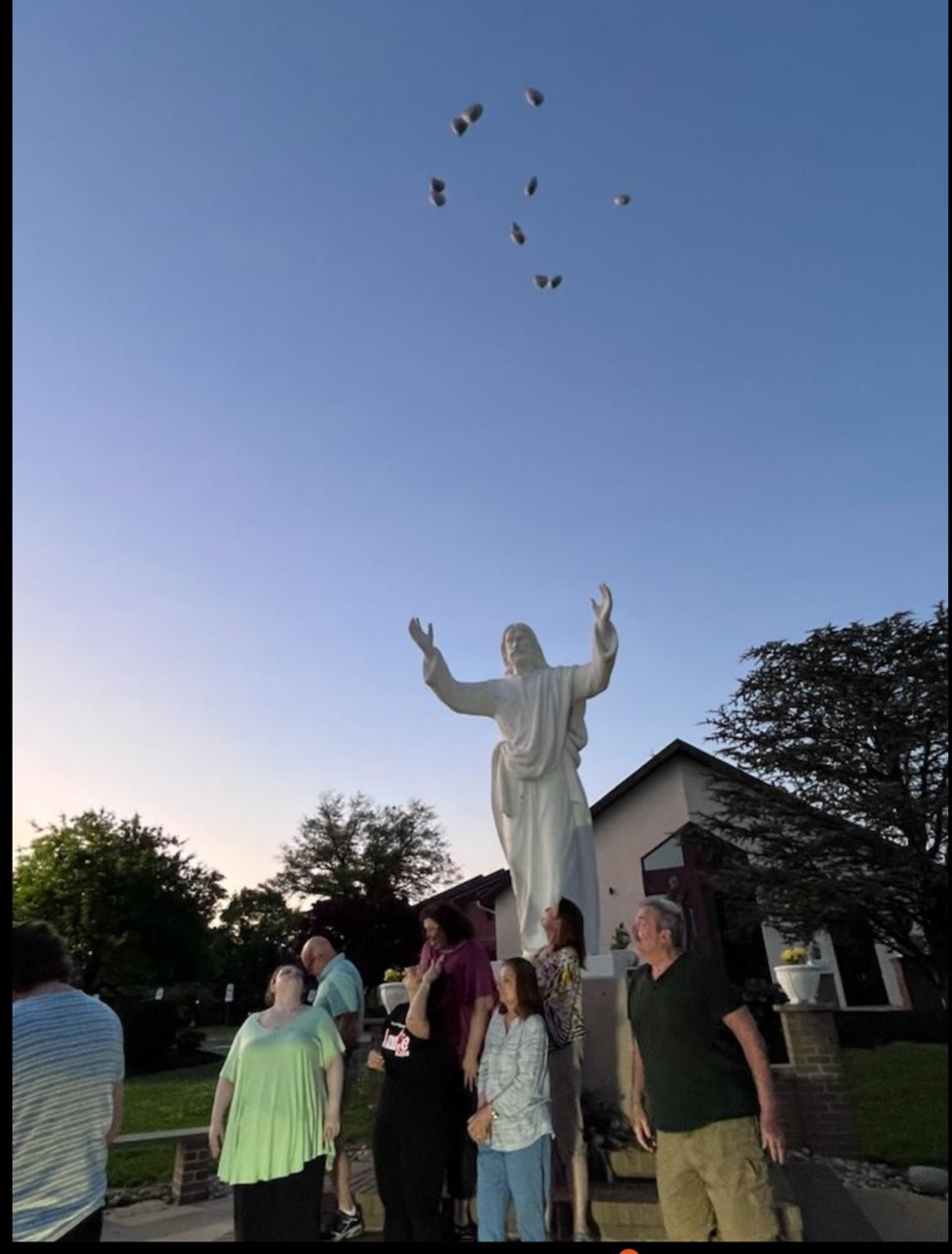 In these two photos. On the last night of our eighth week we organize a celebration of life party. We do a few more story shares, order pizza, sandwiches etc. Then we have them wright on white balloons with a black markers, their intentions for their loved ones. Then we head outside the church parking lot. Start out with a heartfelt prayer, and then at the count of three we release our balloons. They watch them fly away to the heavens.