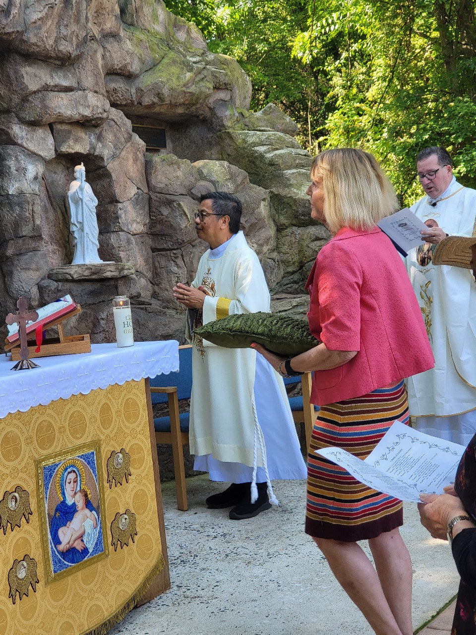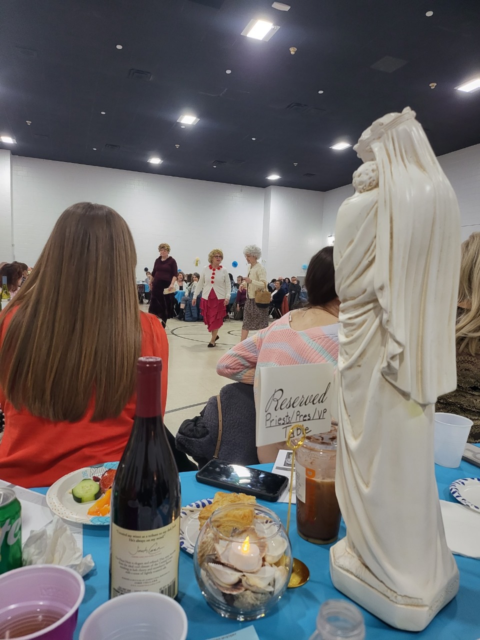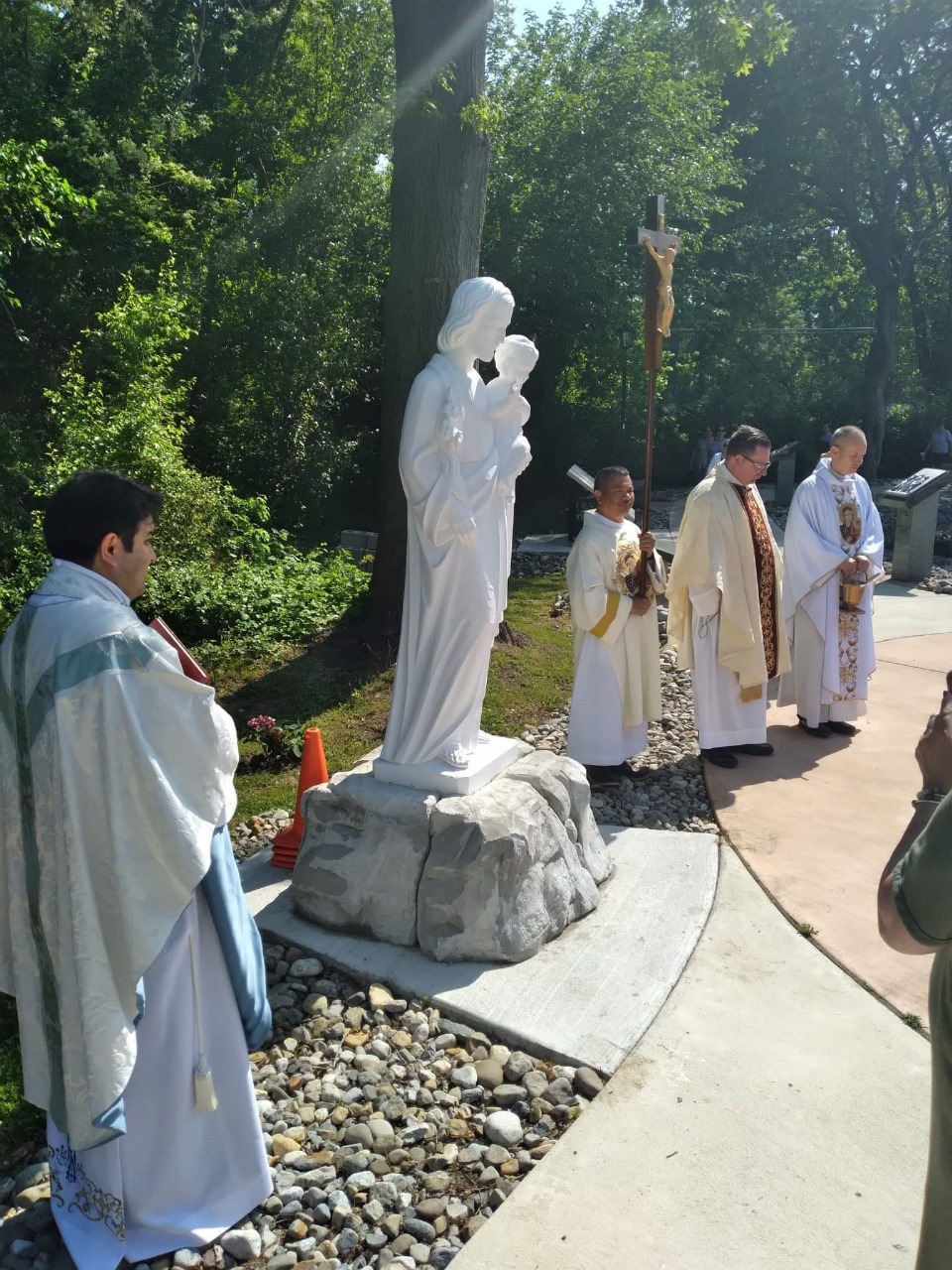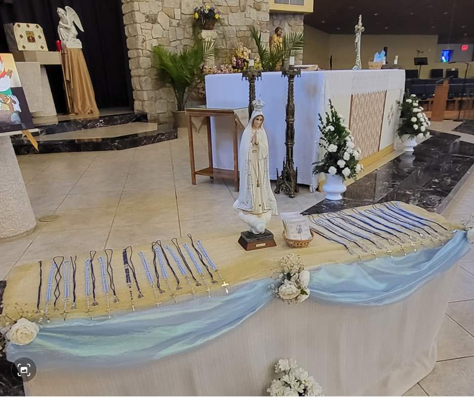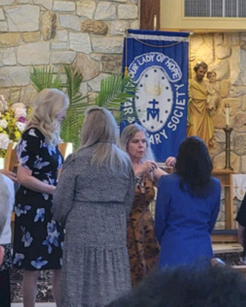 Installation of new members. I was putting on there Miraculous Medals and our Vice President was handing them each a pale blue Rosary. Our Head Pastor followed behind congratulating all the women. Then we took a beautiful group picture with Our Lady Fatima Statue in front of us.