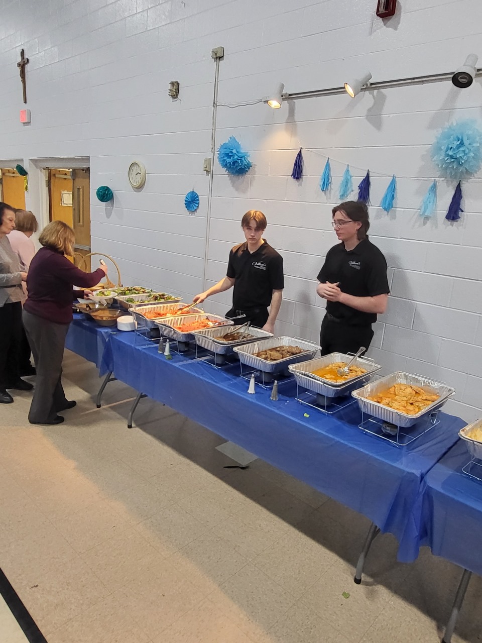 We had it at our Church Parish Hall. We had a total of 255 people attend. Look at all those baskets all our members made. I usually make six to eight baskets a Fundraiser. We gain most of our profit from selling tickets for the basket auctions. We make a couple of dollars from the admission tickets. I try to make sure the admission ticket covers the meal and entertainment. I get my husband Eric involved in these Fundraisers along with my daughter. I make it a family function. It’s a lot of volunteer work but I love doing it.